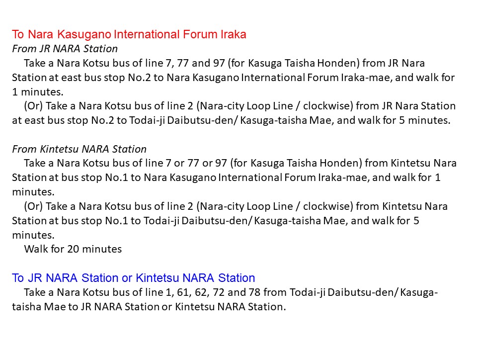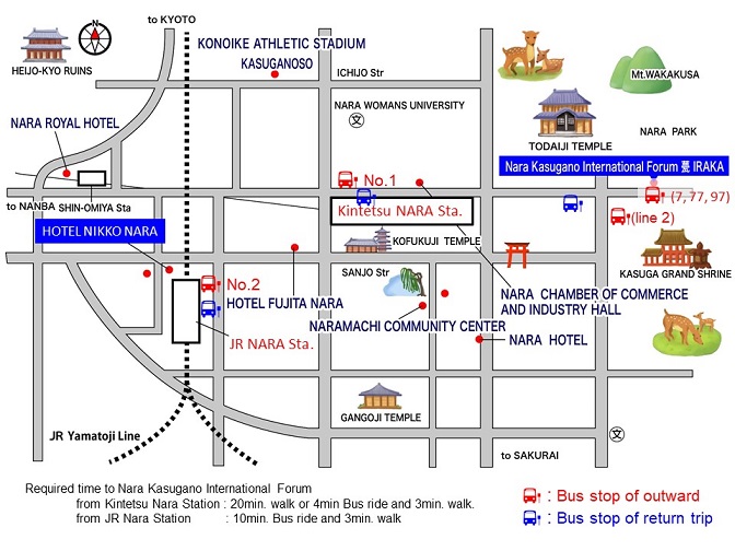 Nara Kasugano International Forum 甍 IRAKA is located in the center of Nara National Park, which is famous for deer and natural beauty. Many world Heritage properties including Todaiji-temple and Kasugataisha-shrine are within walking distance of this forum.